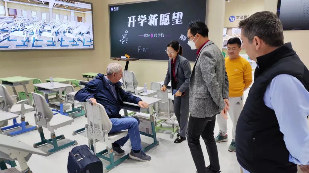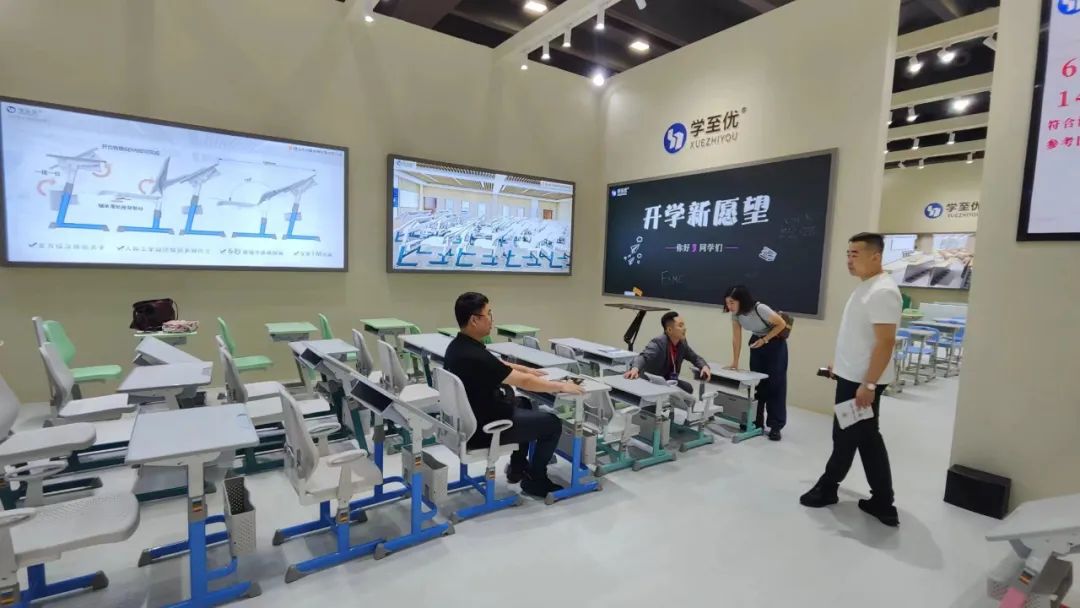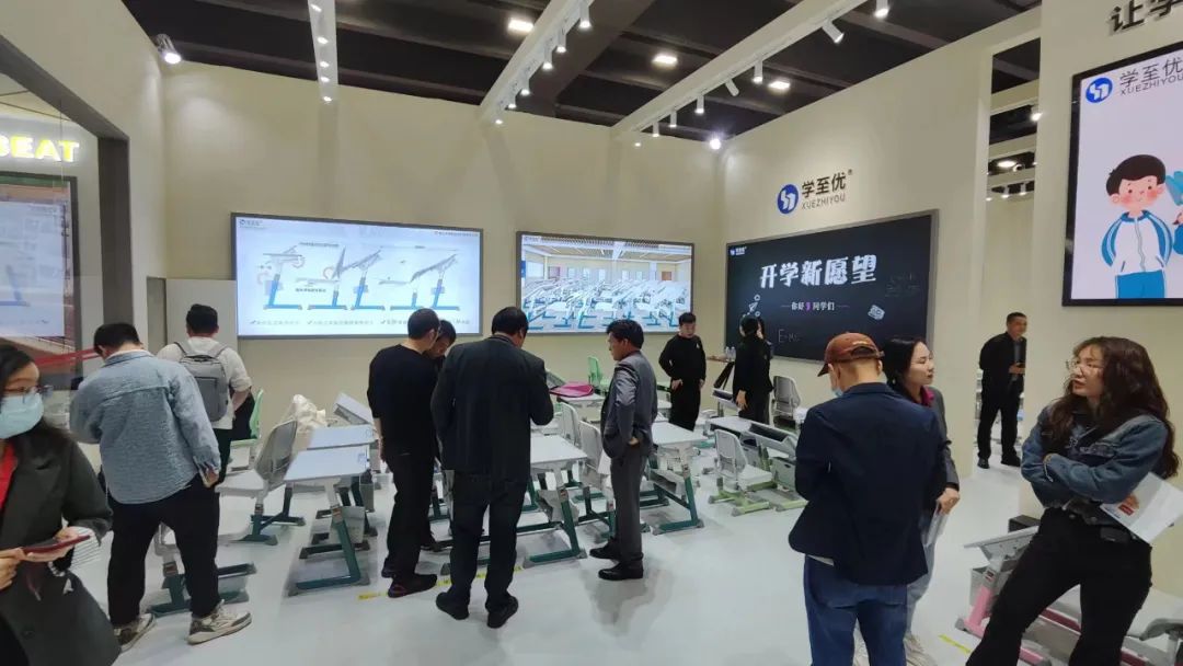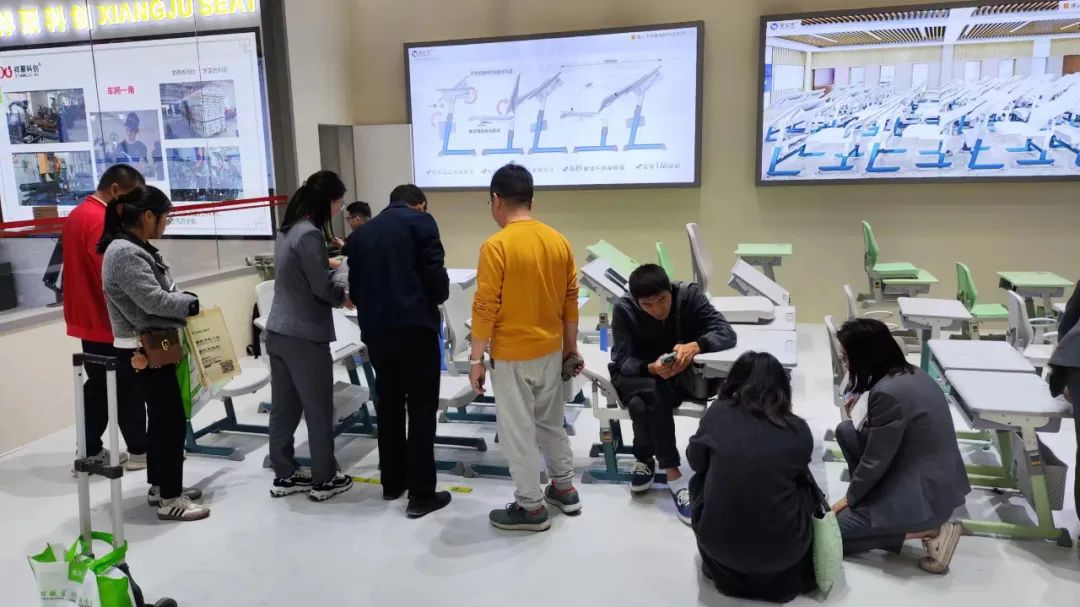 一波又一波的參(cān)展商慕名而來,紛紛駐足參(cān)觀祥聚科創(chuàng)新品午休課桌椅 。