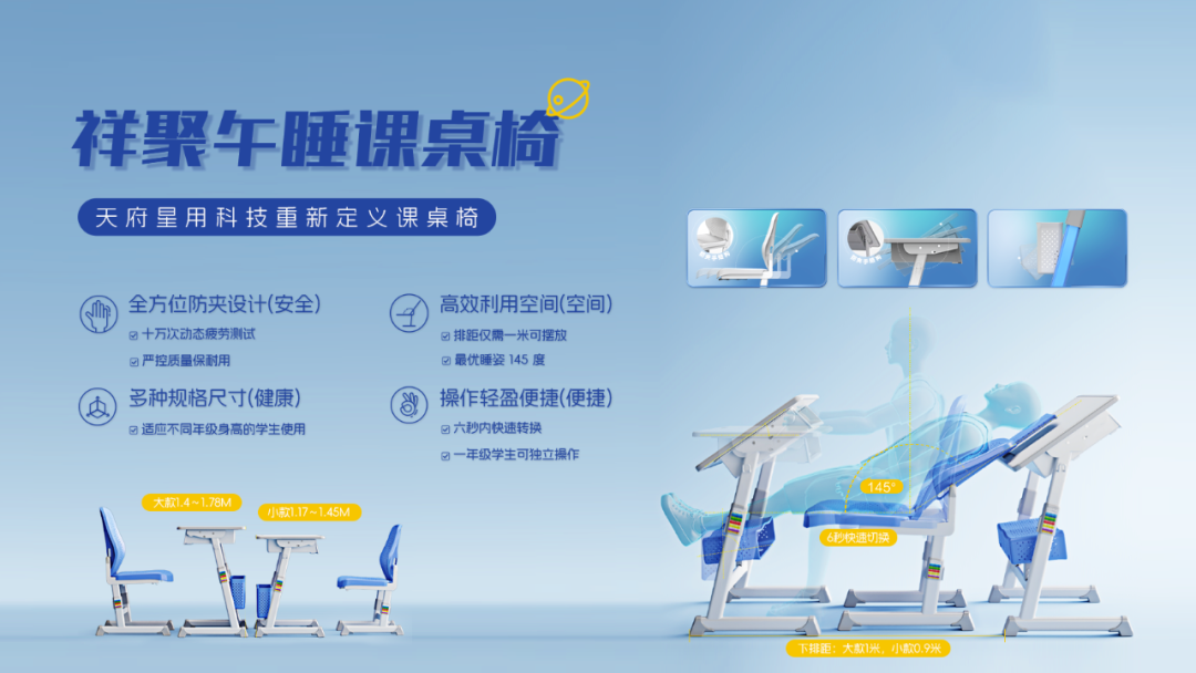 近期推出的午休課桌椅天府星系列新品更是精準解決市場痛點,以安全、健康、空間(jiān)優化和便捷操作爲核心亮點(diǎn),爲學校和教育機構(gòu)提供高效、創(chuàng)新的午休解決方案。