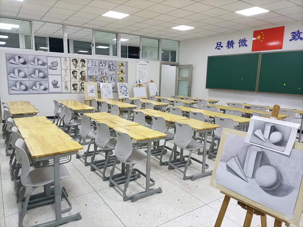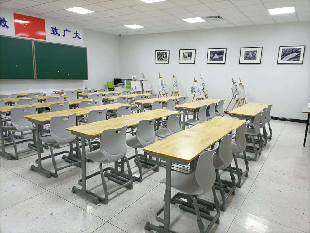 美術教室的選擇上,我們使用瞭原木材質的桌子,原木質感會讓空間更加舒适自然。同時在椅殼顔色的選擇上,使用瞭灰色系點綴,讓整個空間更平靜柔和,學生能夠自由