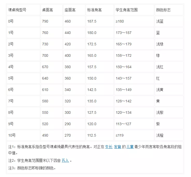 國家《學校課桌椅功能尺寸》标準(GB/T 3976-2014)中規定,中小學課桌和課椅型号各分爲10種大小型号。從0号~10号課桌椅,桌面高度和座面高度逐級遞減,每一型号課座椅均有其适應的學生身高範圍。根據型号表,學生可領到與自己身高相應的課桌椅,有利於(yú)學生的形體發(fā)育和保護視力。