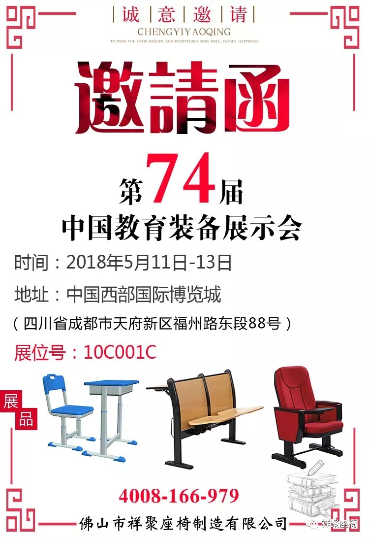 2018年5月11日-13日,祥聚座椅将在第74屆中國教育裝備(bèi)展中展出多款新型教學課桌椅和相關配套産品,屆時歡迎各位採(cǎi)購商到場,給予意見,共同提高教育設備(bèi)行業的品質發展。