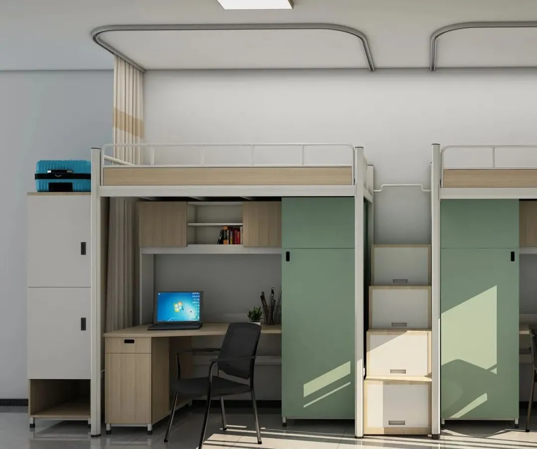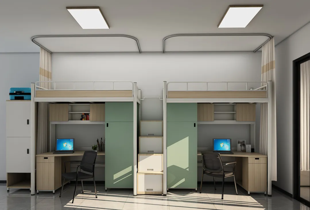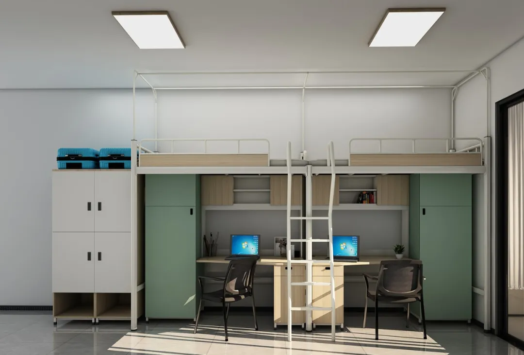衣櫃、書桌、床鋪三位一體,每個人獨享一個小空間。考慮到學生生活學習用品的豐富性,XJ-KY003系列在不同的位置分門别類地設置瞭儲物空間。合理規劃的置物空間,不僅方便學生取用,同時又能培養他們良好的收納習慣,保證宿舍生活的整潔有序。