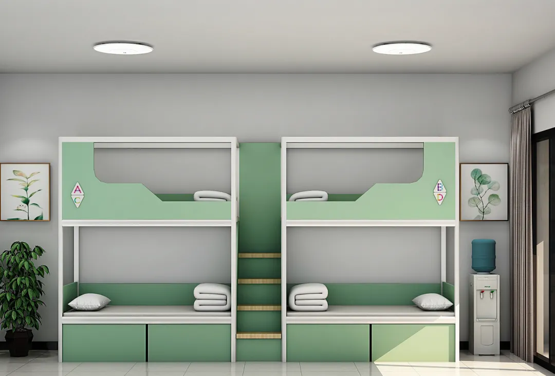 柔和的線條,與色彩完美融合——木紋搭配綠色白色,讓空間的層(céng)次更加豐富,也讓生活與學習之外,有著(zhe)更多的視覺美感與缤紛趣味;清新雅緻,爲學生營造溫馨舒适的空間氛圍。