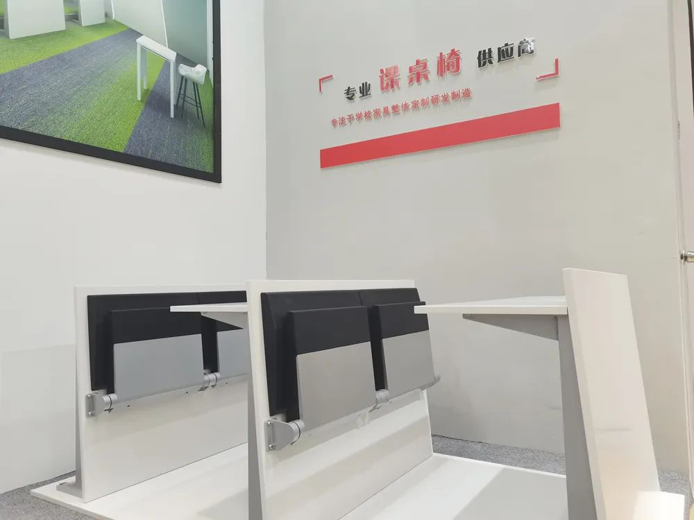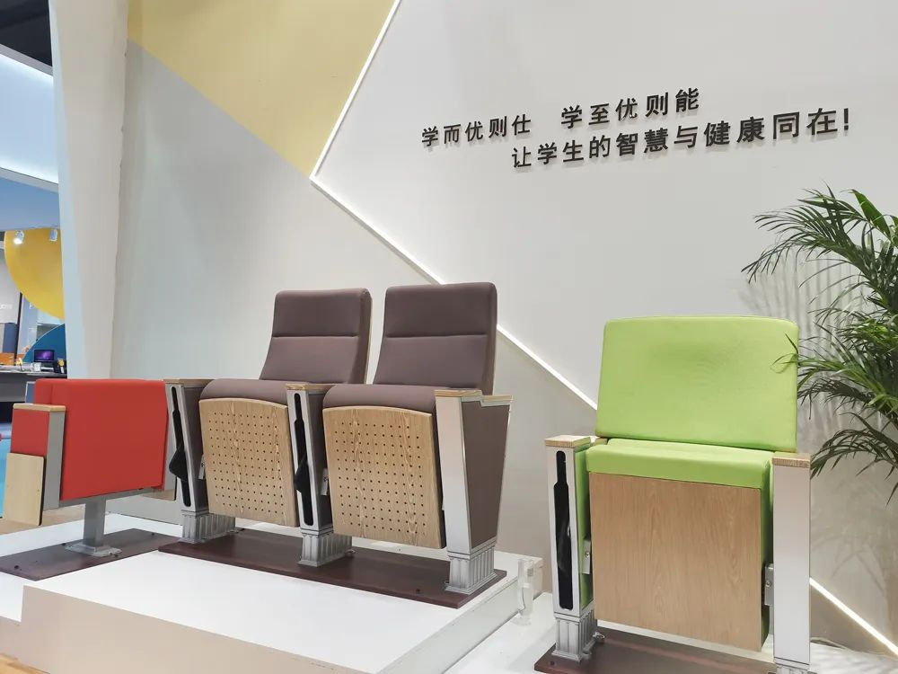 此次展會祥聚帶來瞭自主研發的新品,單人課桌椅、階梯課桌椅以及禮堂椅等家具。