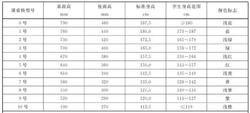 1998 年我國衛生部頒布瞭(le)《學校課桌椅衛生國家标準》,確定瞭(le)9類不同身高的學生使用的桌椅高度标準。2003年,國家質檢總局又頒布《學校課桌椅功能尺寸标準》,根據不同身高確定瞭(le)10類桌椅高度标準,各型号配備給不同身高的使用者。一個型号課桌椅身高跨度爲14厘米,相互交叉,其中最低爲49厘米(小學低年級),最高爲76厘米(高中)。最大型号的課桌适用於(yú)身高在170厘米以上的學生。