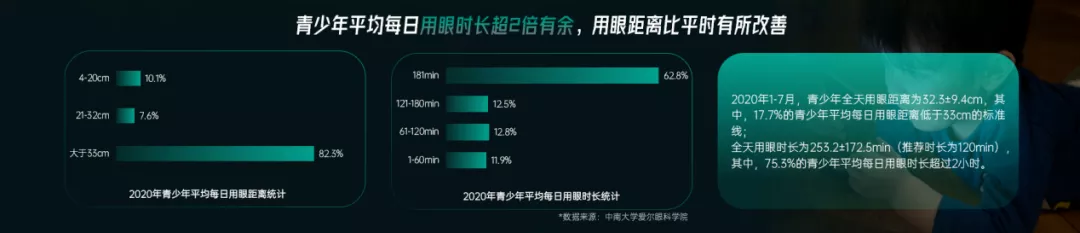 《報(bào)告》數據顯示:在用眼時長(zhǎng)方面,青少年平均每天用眼時長(zhǎng)在4小時以上,超過推薦值(<2小時)的1倍有餘。