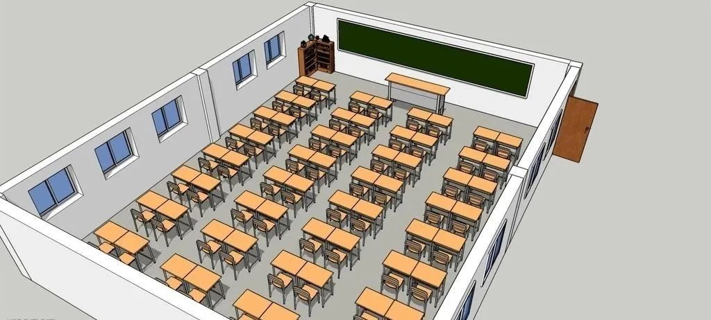目前仍較多學校上課的教室布局方式,是填鴨式教學的排列擺(bǎi)放桌椅,但這已不适應現代教學中經常需要讨論的現實情況,需要對(duì)其進行改進。