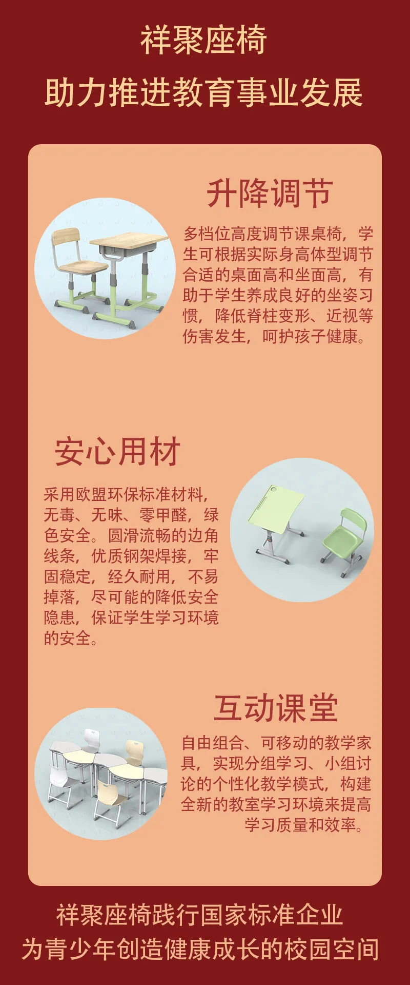 與國家共發展,與中國教育共成長,“美好校園共建者”是祥聚座椅擁抱的全新賽道。作爲一家集研發、生産(chǎn)、銷售、服務於(yú)一體的現代...