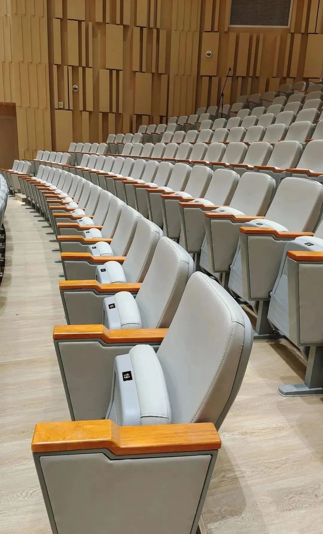 禮堂椅採用阻尼慢回位設計,有效隔絕瞭複位過程中可能産生的音響,從而減少瞭噪音對環境的幹擾。此外,椅座的底部還配備瞭靜音孔,可以有效吸收聲音,進一步提升瞭座位的聲學性能,創造更加純淨的聲音環境。